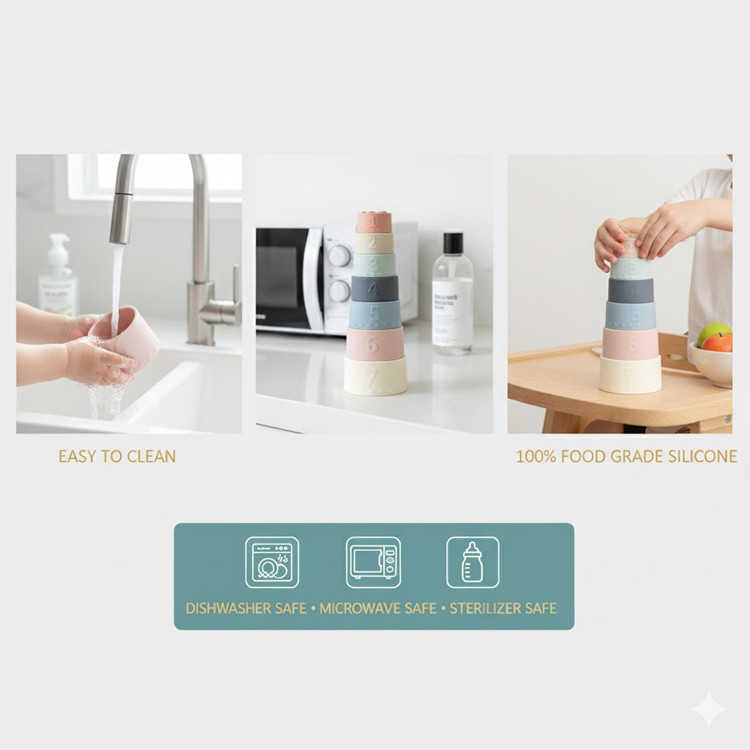 सिलिकॉन स्टैकिंग खिलौने, विशेष रूप से, जल प्रतिरोधी और फफूंद-मुक्त होते हैं - स्नान के समय, बाहरी खेल या दैनिक संवेदी गतिविधियों के लिए एकदम उपयुक्त होते हैं।